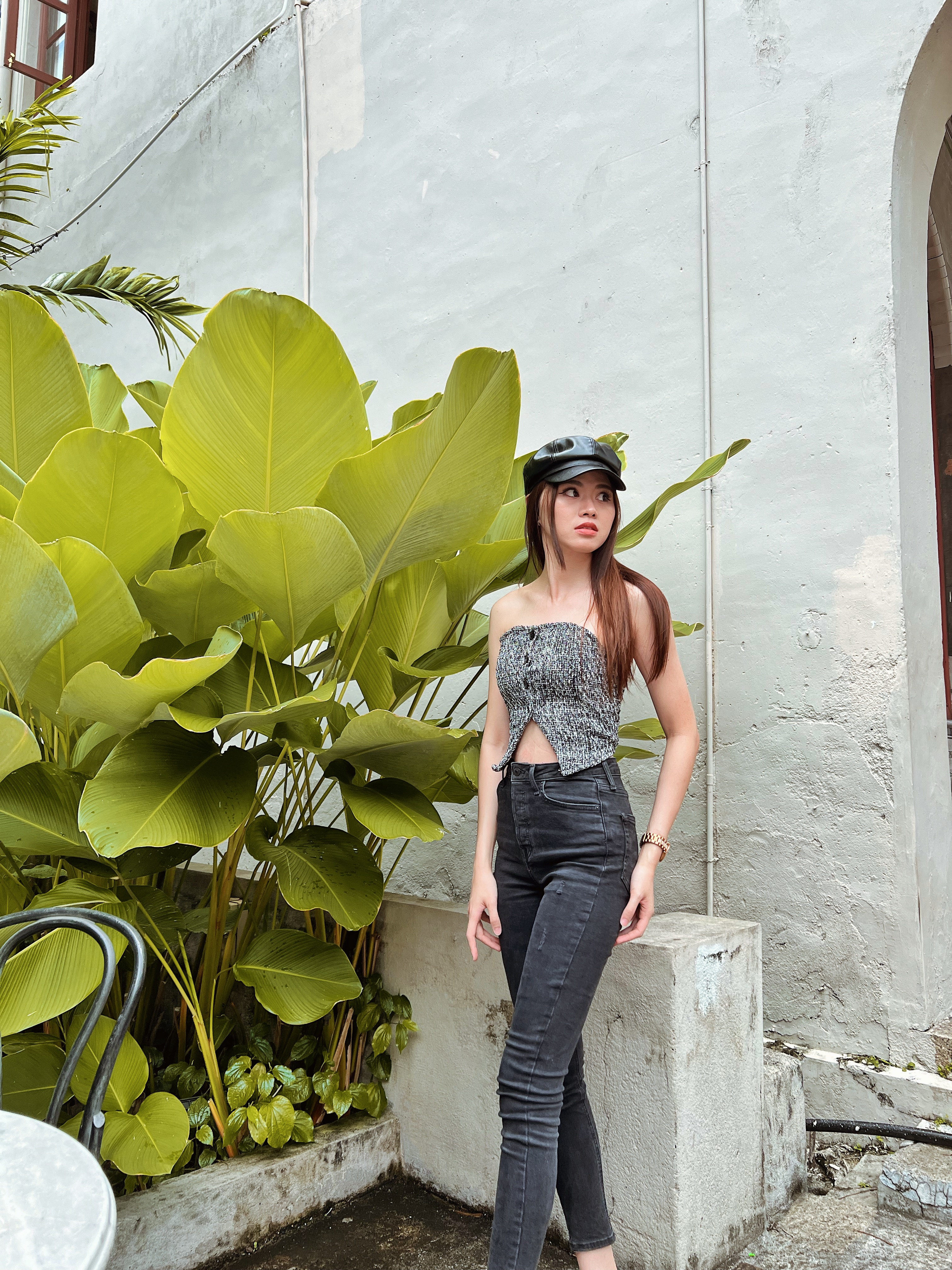 Details: This woven bandeau top seamlessly combines timeless elegance with a touch of contemporary flair. This piece features delicate front buttons for a vintage charm and corset-style bodice to ensure a flattering fit, accentuating your curves. An opening at the hem adds a playful twist to the classic design. It is a top that brings a sense of nostalgia to modern fashion and works perfectly with high-waisted jeans.