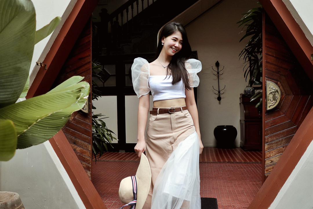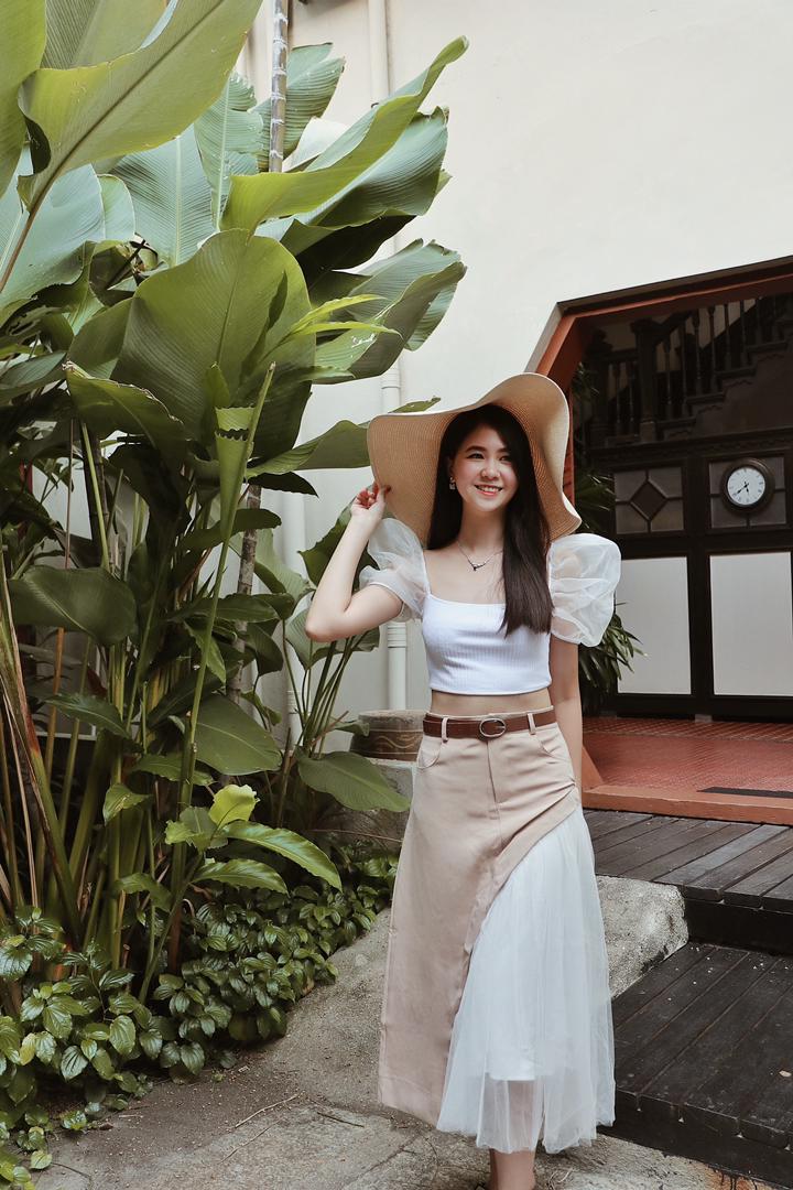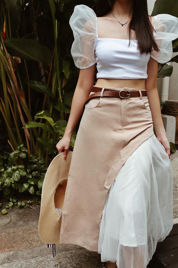 Details: The midi skirt combines camel cotton and white tulle in a unique blend, showcasing a perfect fusion of elegance and modernity. The camel cotton offers a natural, comfortable texture with a warm feel, while the white tulle hem is light and airy, creating a dreamy and feminine effect. The asymmetrical design skillfully merges these two contrasting fabrics, giving the skirt a distinctive sense of dimension and depth, breaking away from traditional, single-style aesthetics. The overall look is both artistic and creative, yet maintains an effortless elegance. Suitable for various occasions, it radiates a unique and stylish charm.