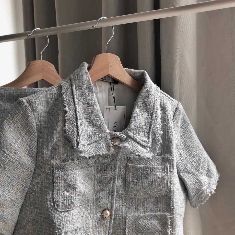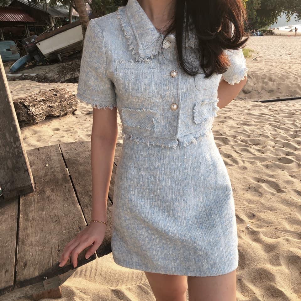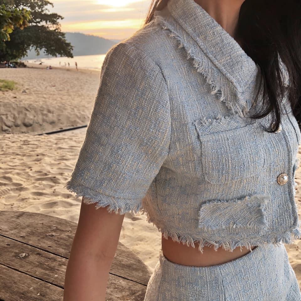 Details: The light blue tweed top and skirt set exudes an air of elegance and sophistication, crafted from woven fabric for a refined texture that carries a timeless vintage charm. The square neckline is bold and sleek, highlighting the neckline while imparting a fresh and noble aura to the wearer. Delicate, single-row vintage buttons add a touch of unique retro flair, elevating the overall design with a distinctive character. The short sleeves are simple yet elegant, offering a light and comfortable feel. Fringe detailing along the edges of the top brings a playful and dynamic element, adding layers and a stylish finish to the ensemble. This set perfectly blends nobility, refinement, sweetness, and vintage charm, making it suitable for any occasion, showcasing a poised and graceful socialite style with an elegant sense of fashion.