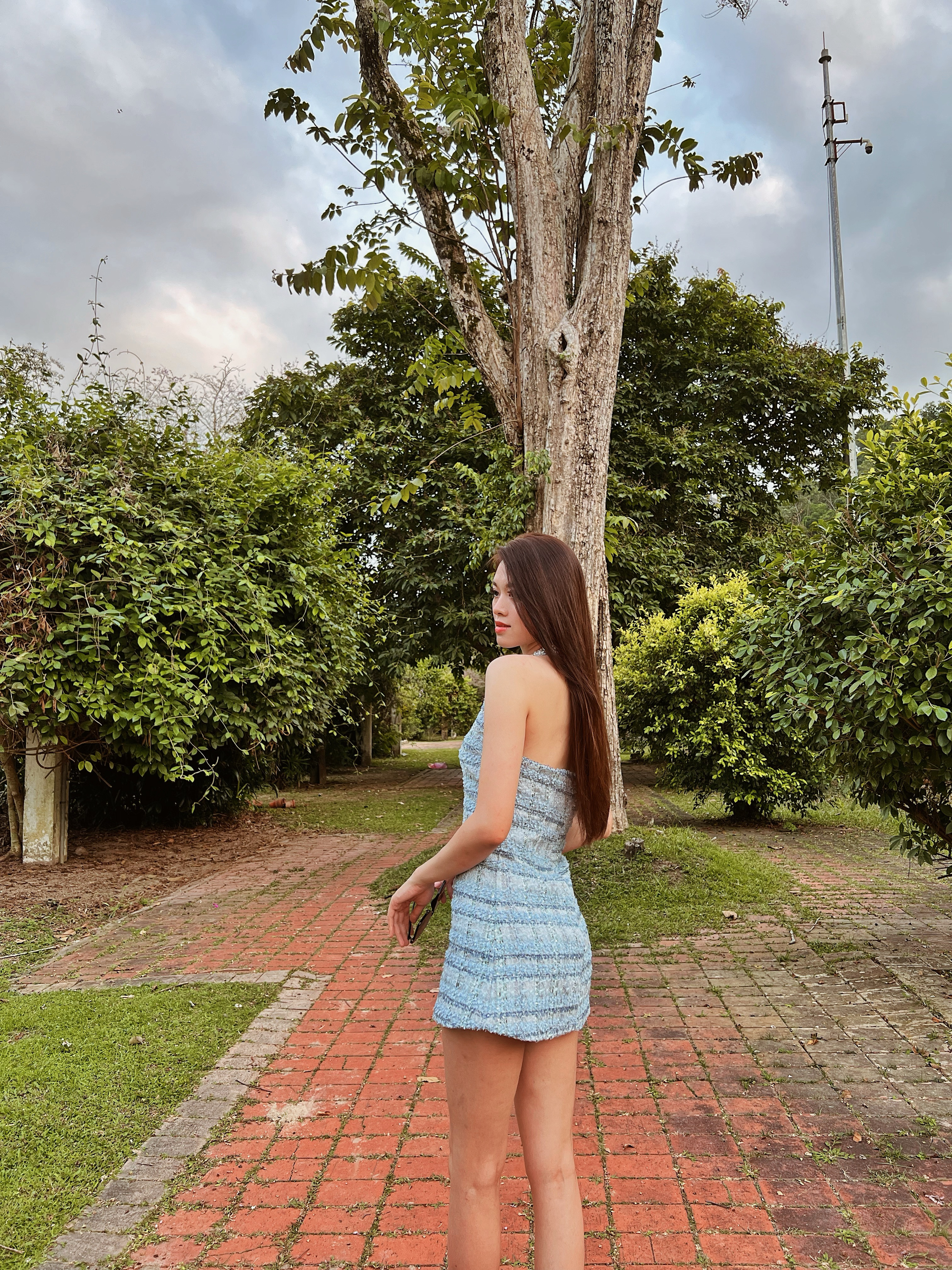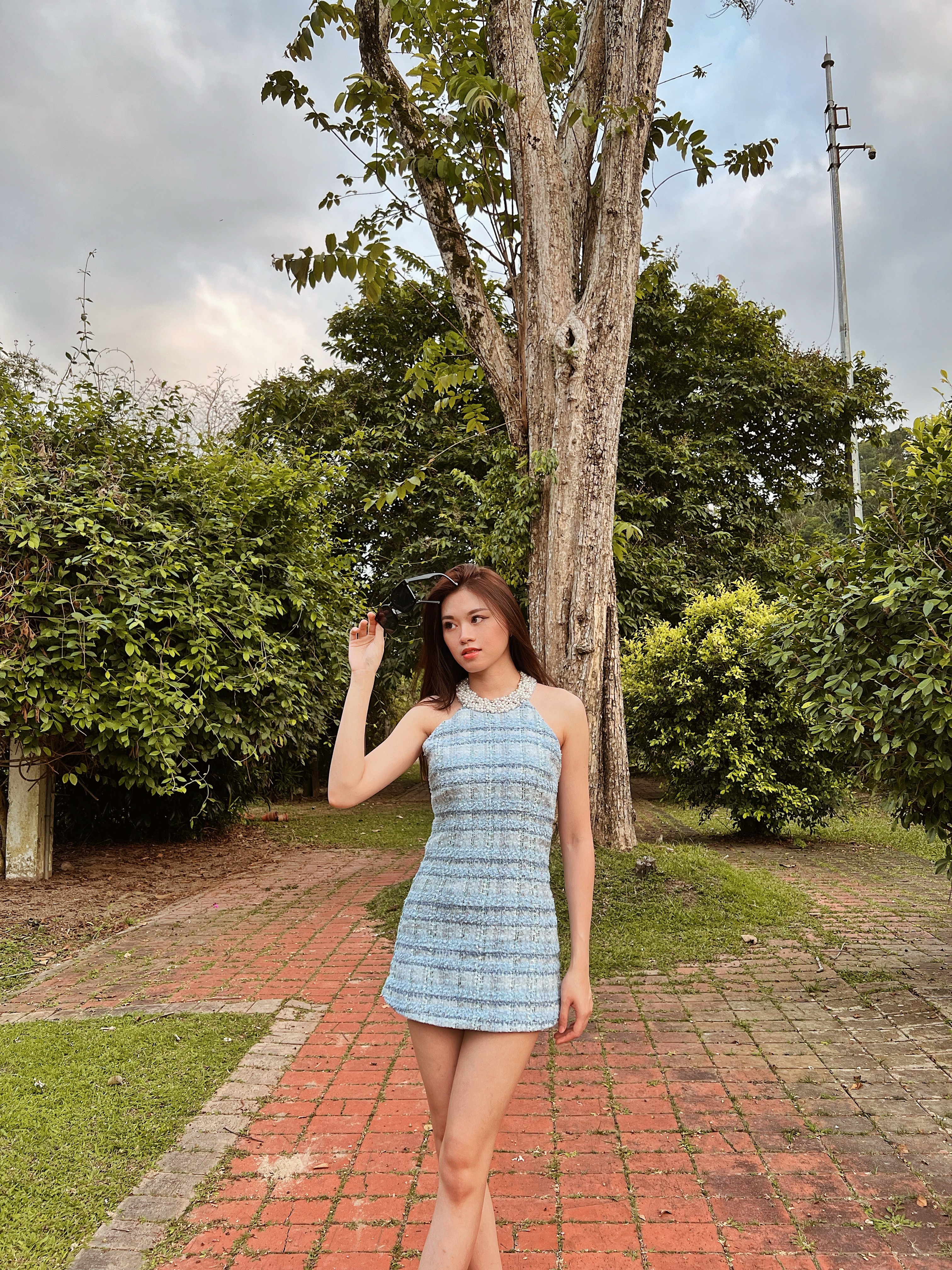 Details: Step into sophistication with our enchanting blue sheath mini dress, adorned with a mesmerizing grid pattern. Designed to captivate with its sweet and glamorous allure, this dress features a halter neckline embellished with delicate pearls and shimmering crystals, exuding an air of timeless elegance. The low back adds a hint of allure and sophistication, while the exquisite craftsmanship promises to make you feel like the epitome of glamour at any event. Embrace luxury and radiate charm with every step you take in this exquisite ensemble.