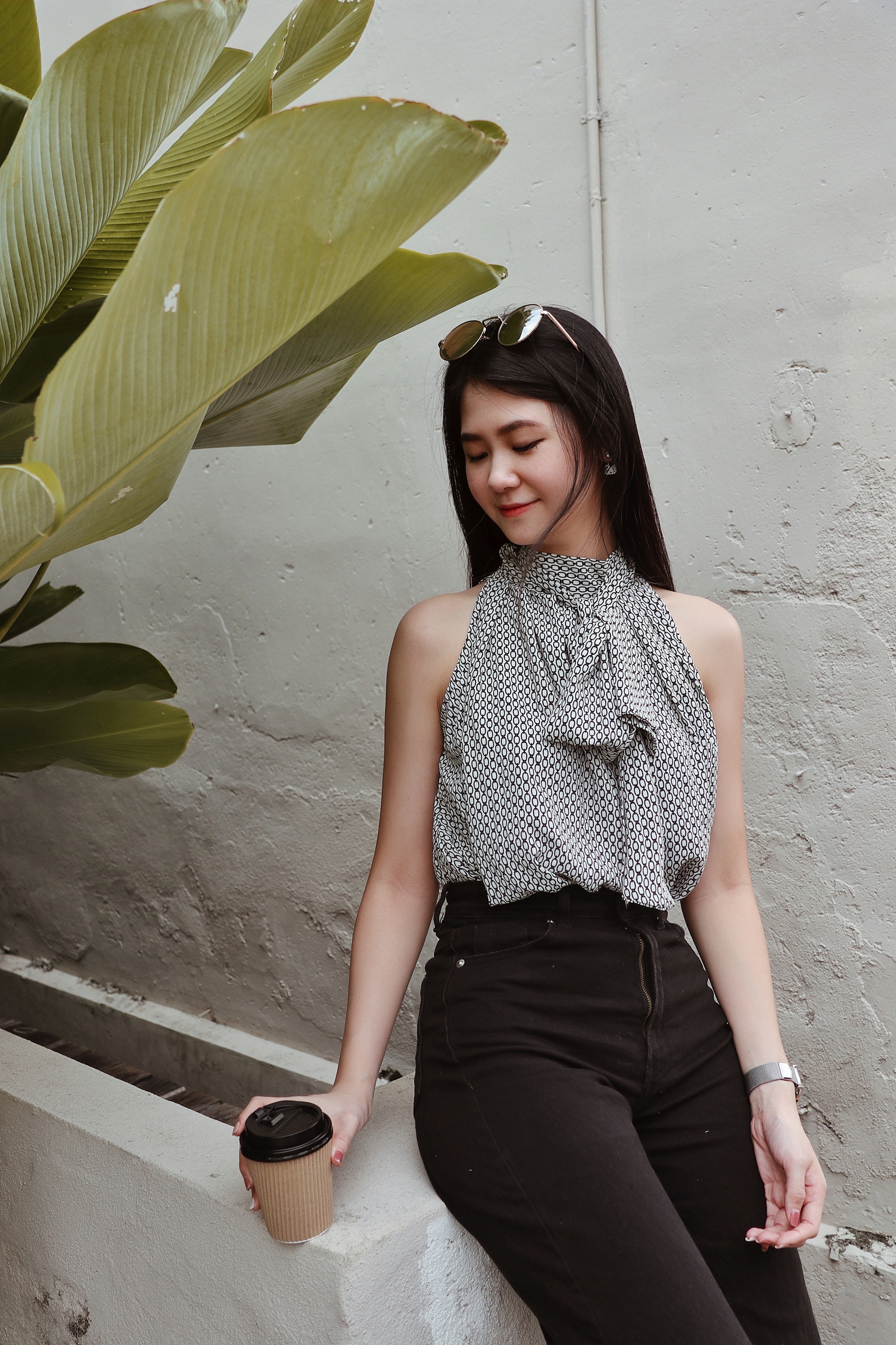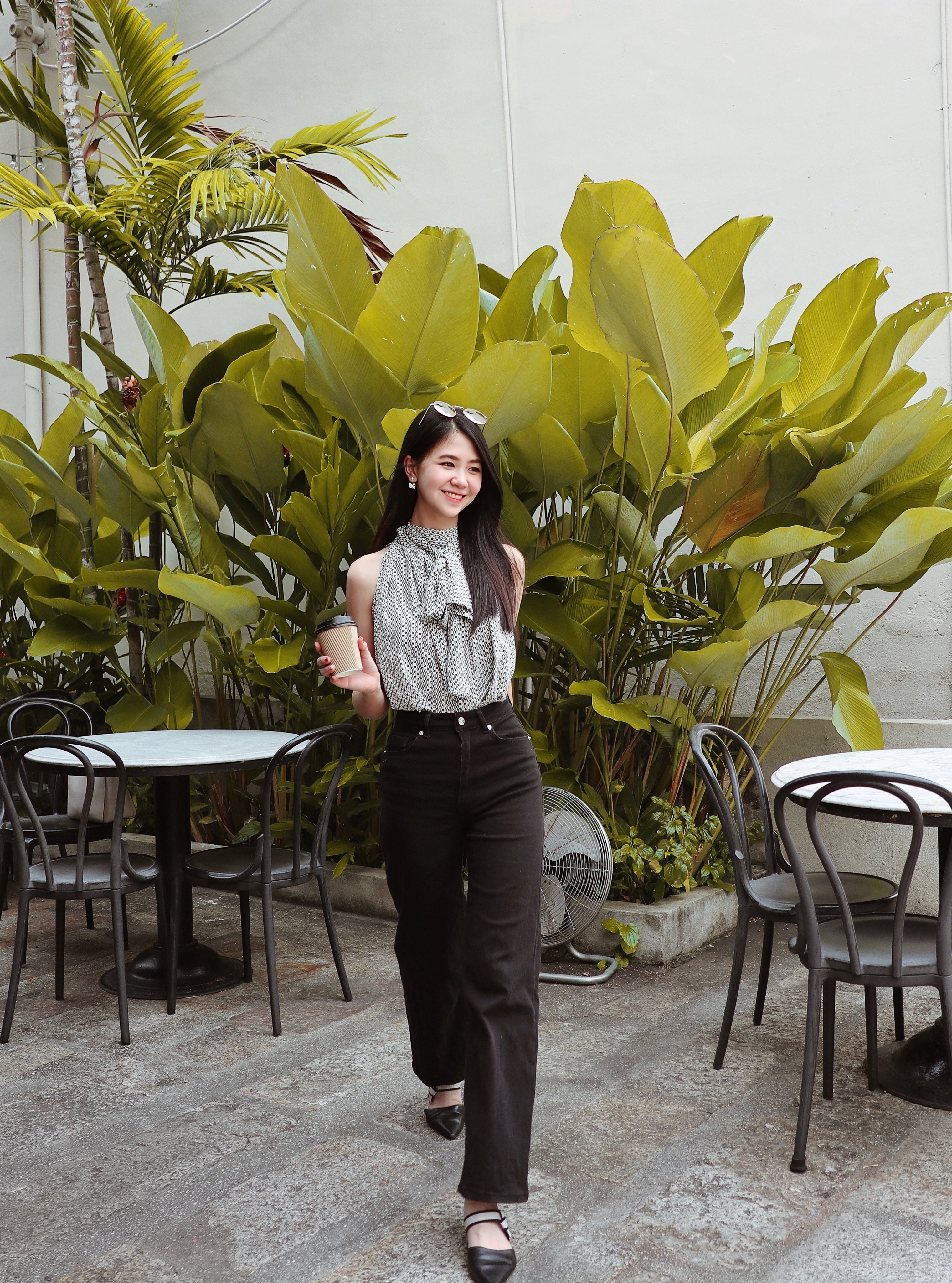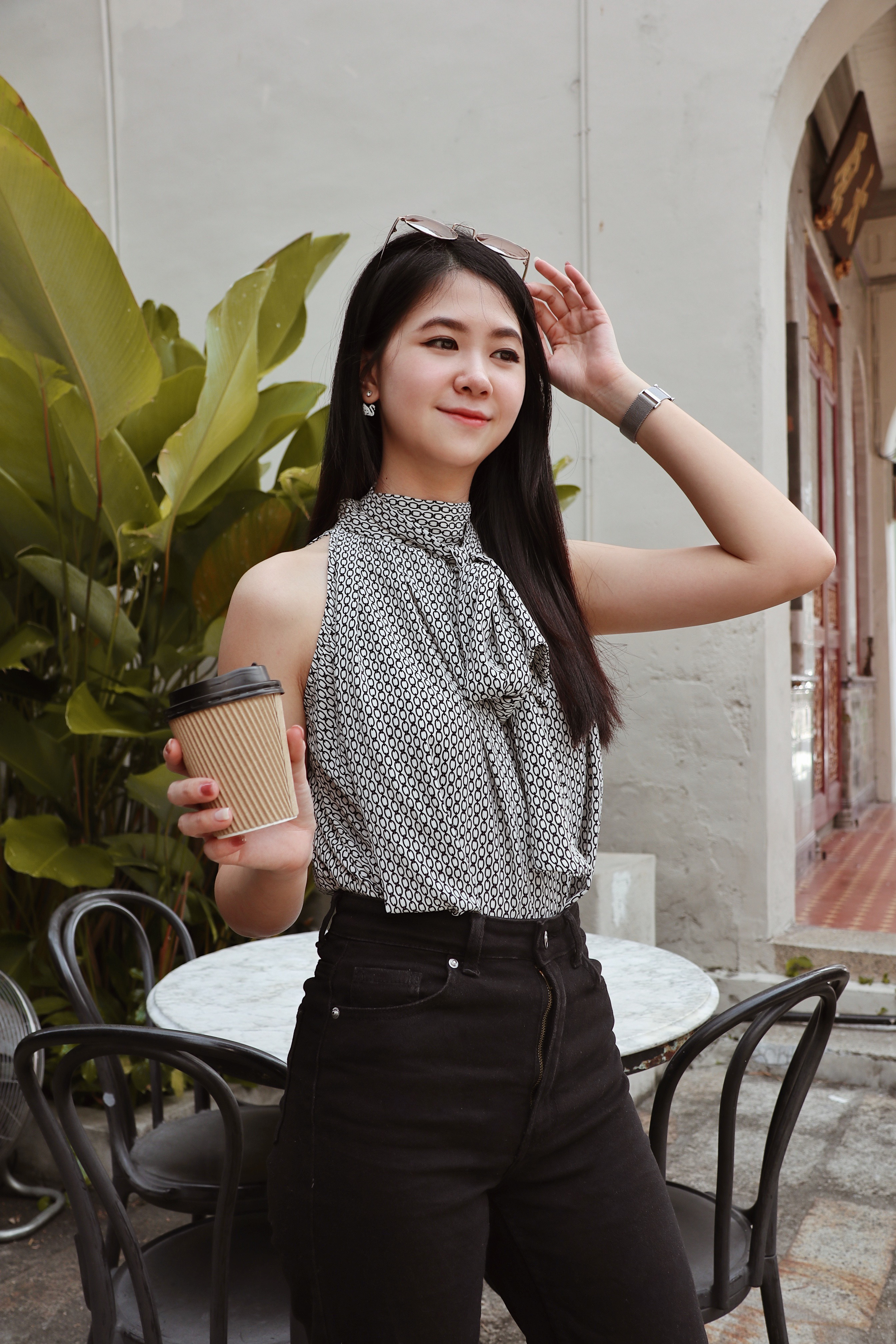 Details: The high-neck blouse is crafted from lightweight, silky chiffon, adorned with intricate chain prints, showcasing a unique sense of fashion and refined texture. The sleeveless design elegantly reveals the collarbones, highlighting the slender beauty of the neck, exuding both sensuality and sophistication. The front tie detail is versatile, allowing you to style it as a sweet bow or drape it to the side, adding layers and a relaxed charm. Available in black and white, the black offers a sleek, sophisticated appeal, while the white exudes freshness and grace. Perfect for various occasions, this blouse seamlessly blends elegance, style, and luxury, capturing both femininity and refinement.