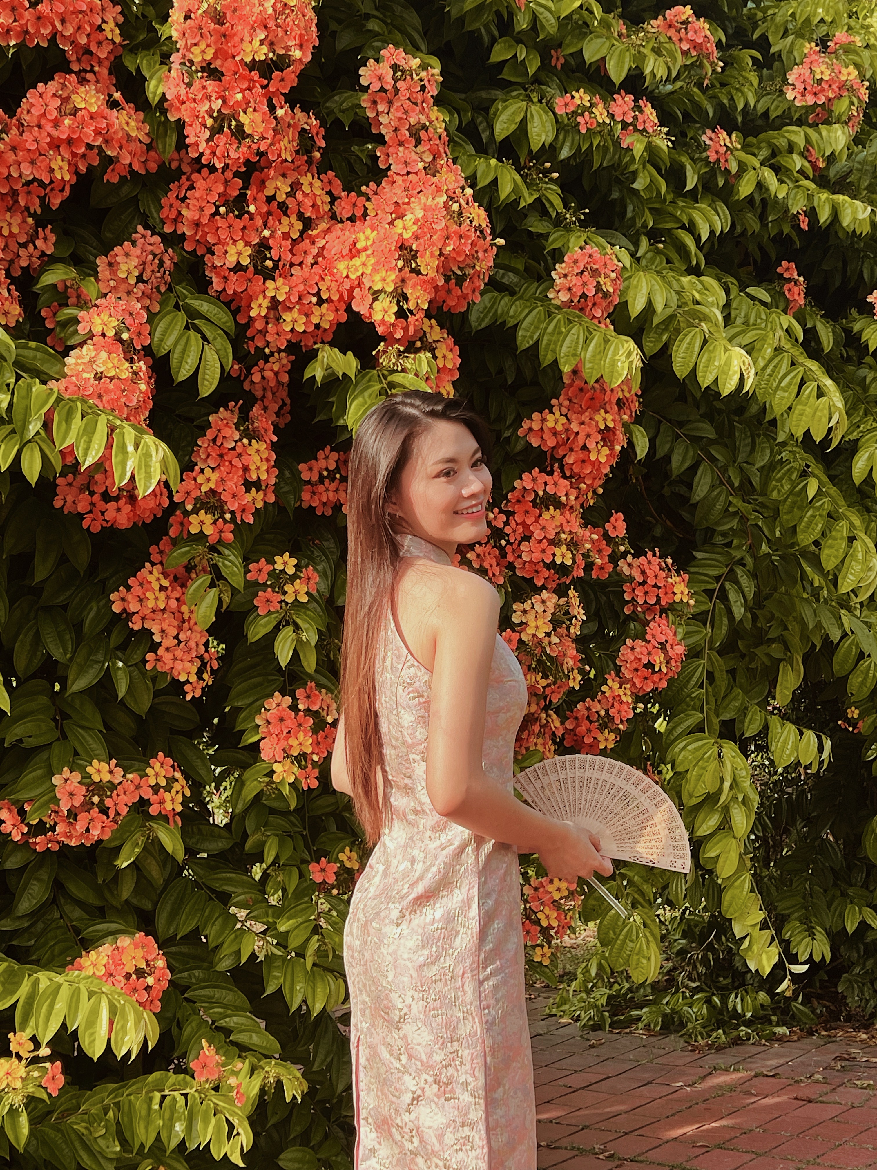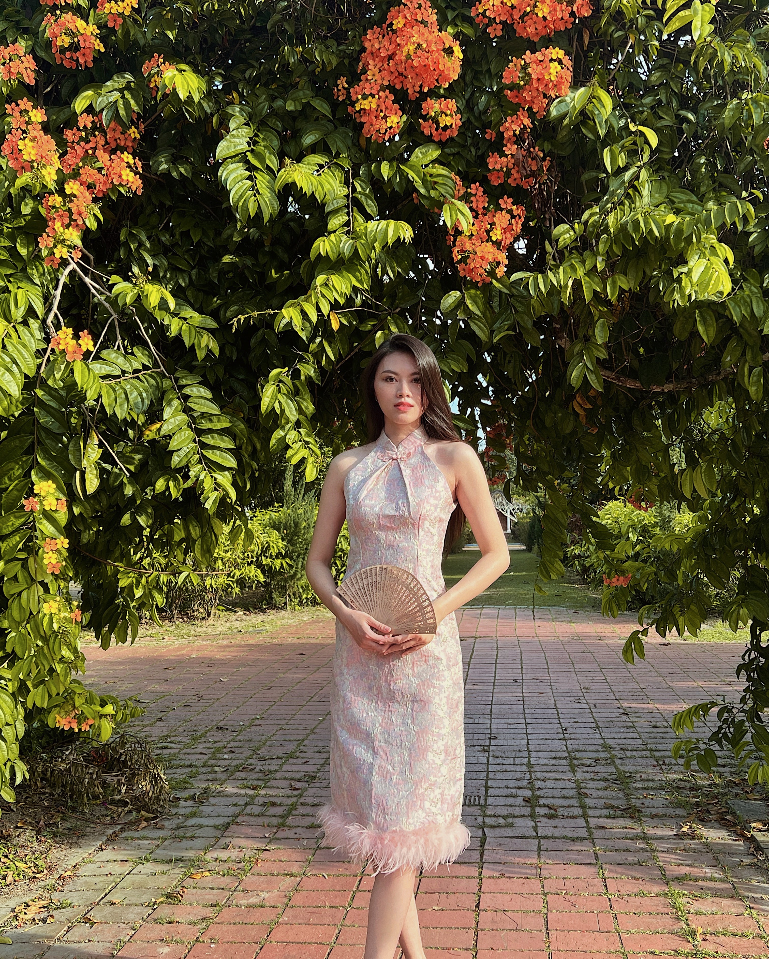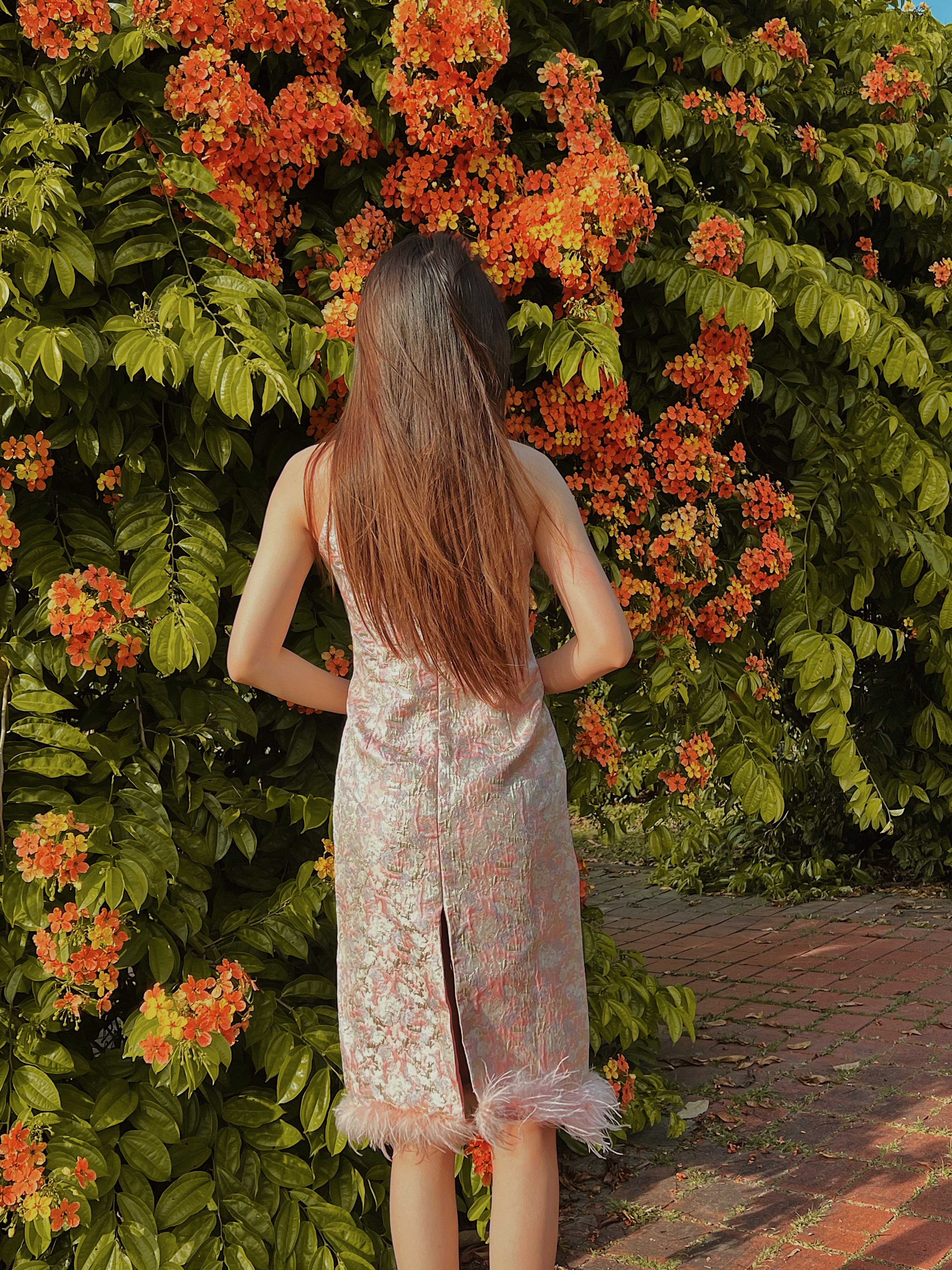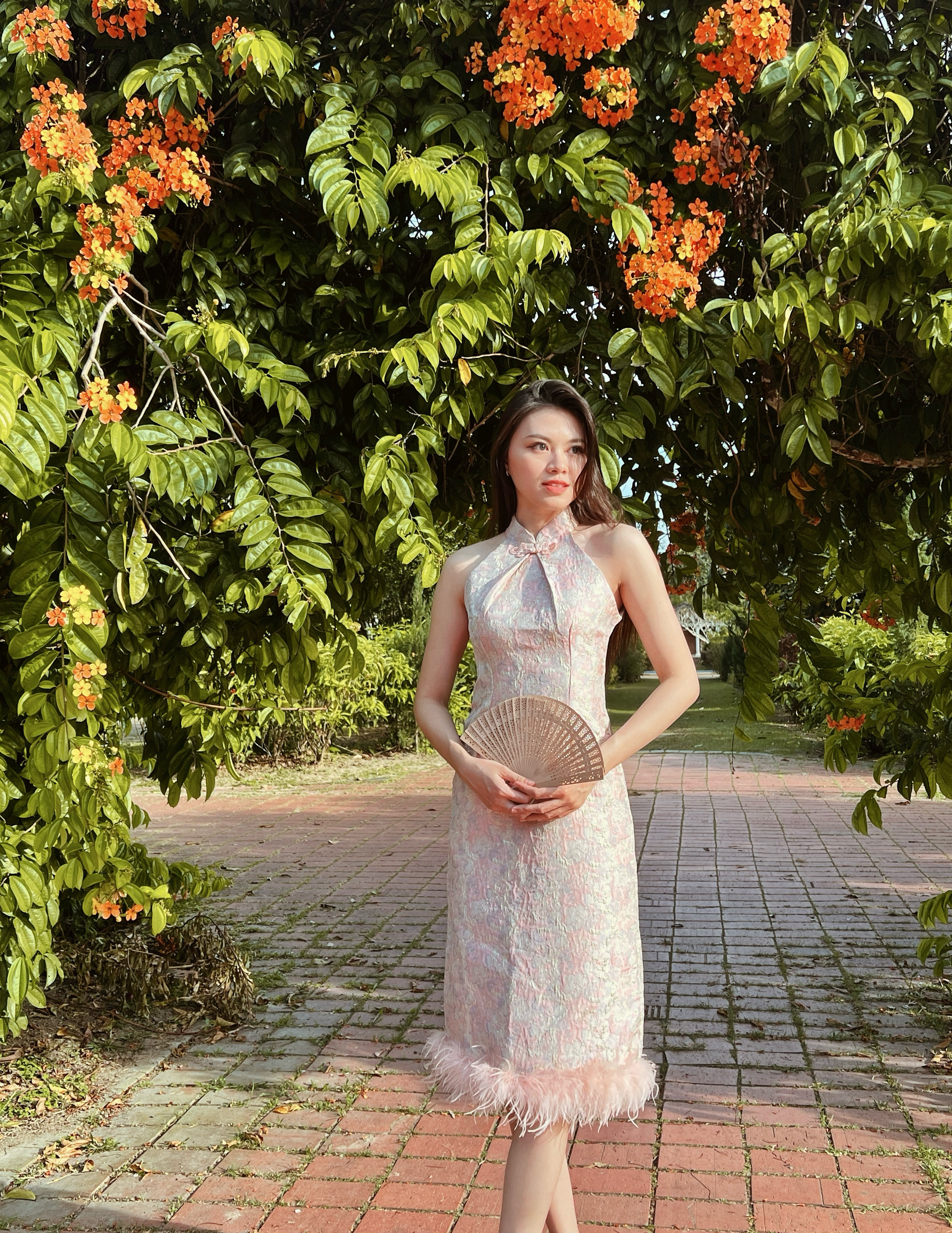 Details: This modern cheongsam is a sartorial masterpiece, combining traditional allure with contemporary flair. The chic turtle neck lends an air of sophistication, while the sleeveless design adds a modern touch. Its slim-fit silhouette gracefully accentuates your figure, providing a perfect balance of grace and allure. The exquisite feather trim at the bottom adds a luxurious and playful element, making a bold statement. The modern cheongsam print is a testament to the fusion of heritage and modernity, showcasing a unique blend of cultural richness and chic style in one stunning ensemble. Embrace this outfit, and celebrate the CNY with its elegance and charm.