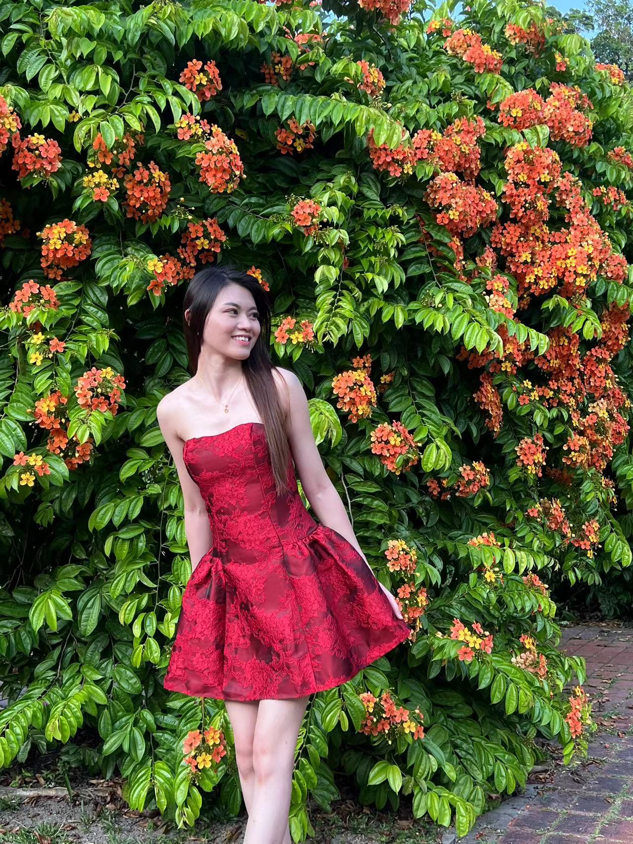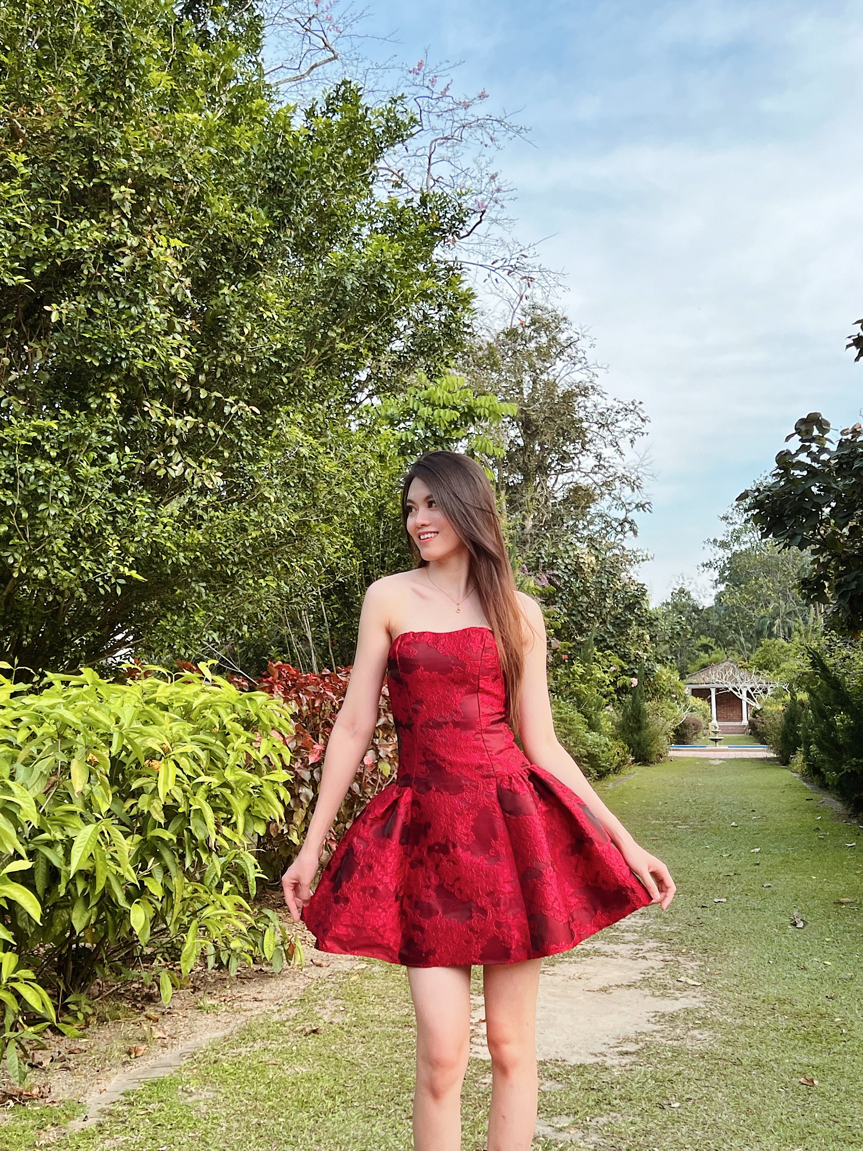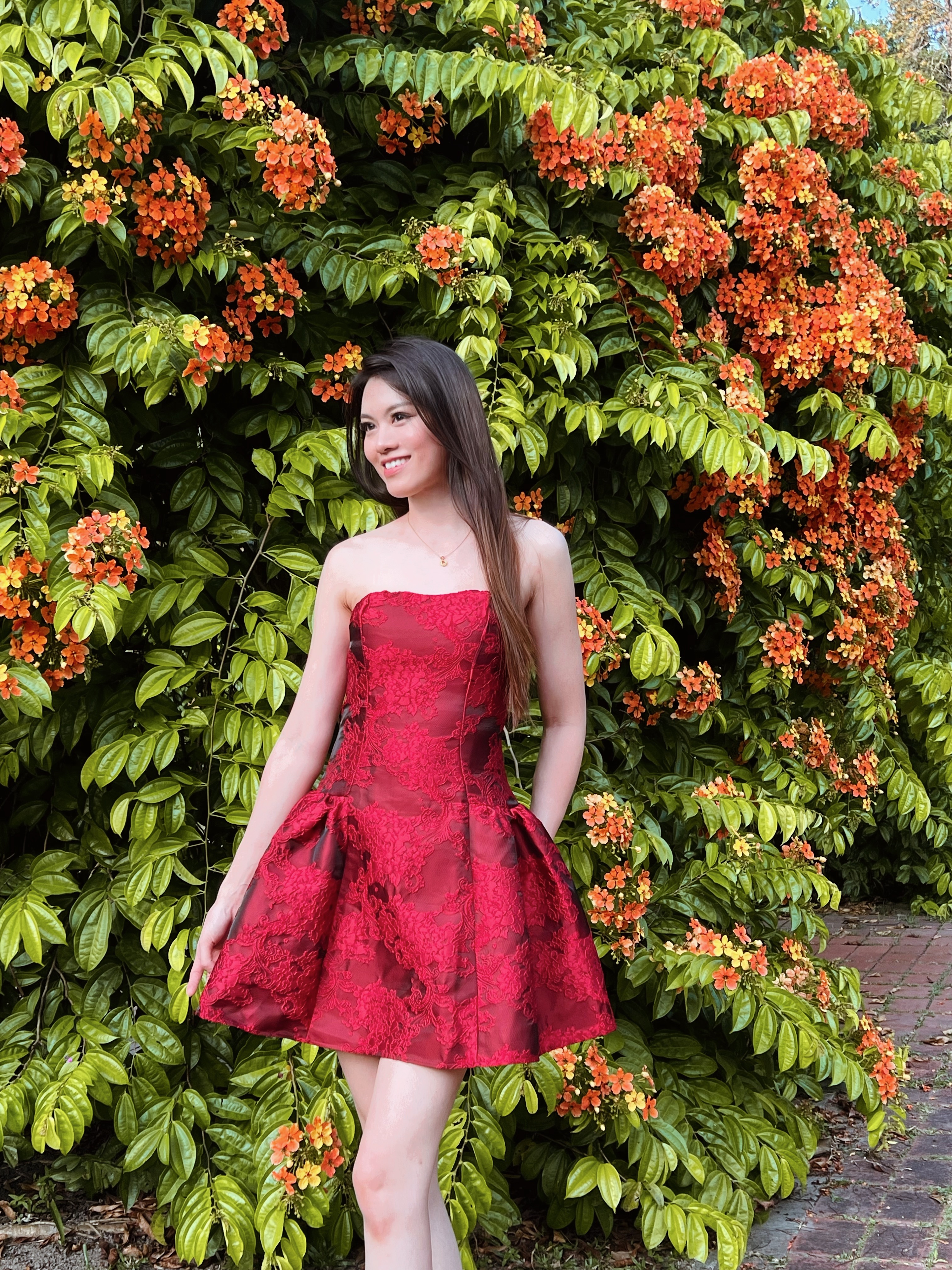 Details: Embrace the festive spirit in this radiant red textured floral strapless mini dress. Its A-line silhouette adds a touch of grace, while the flared bottom exudes playful charm. An ideal choice for celebrating Chinese New Year in style, this dress embodies the vibrancy of the occasion with its rich red hue and intricate floral details. Step into the festivities with confidence and flair!