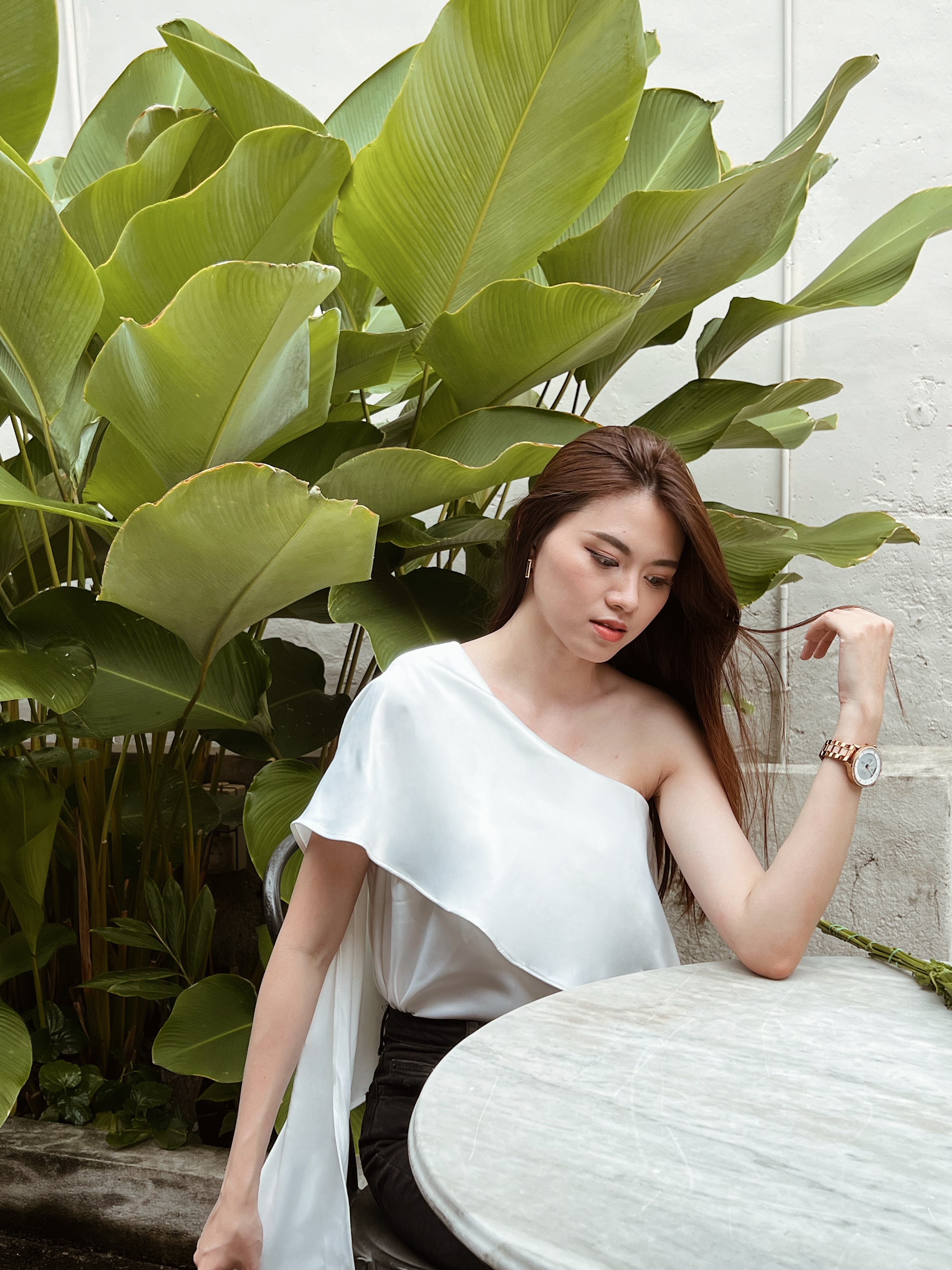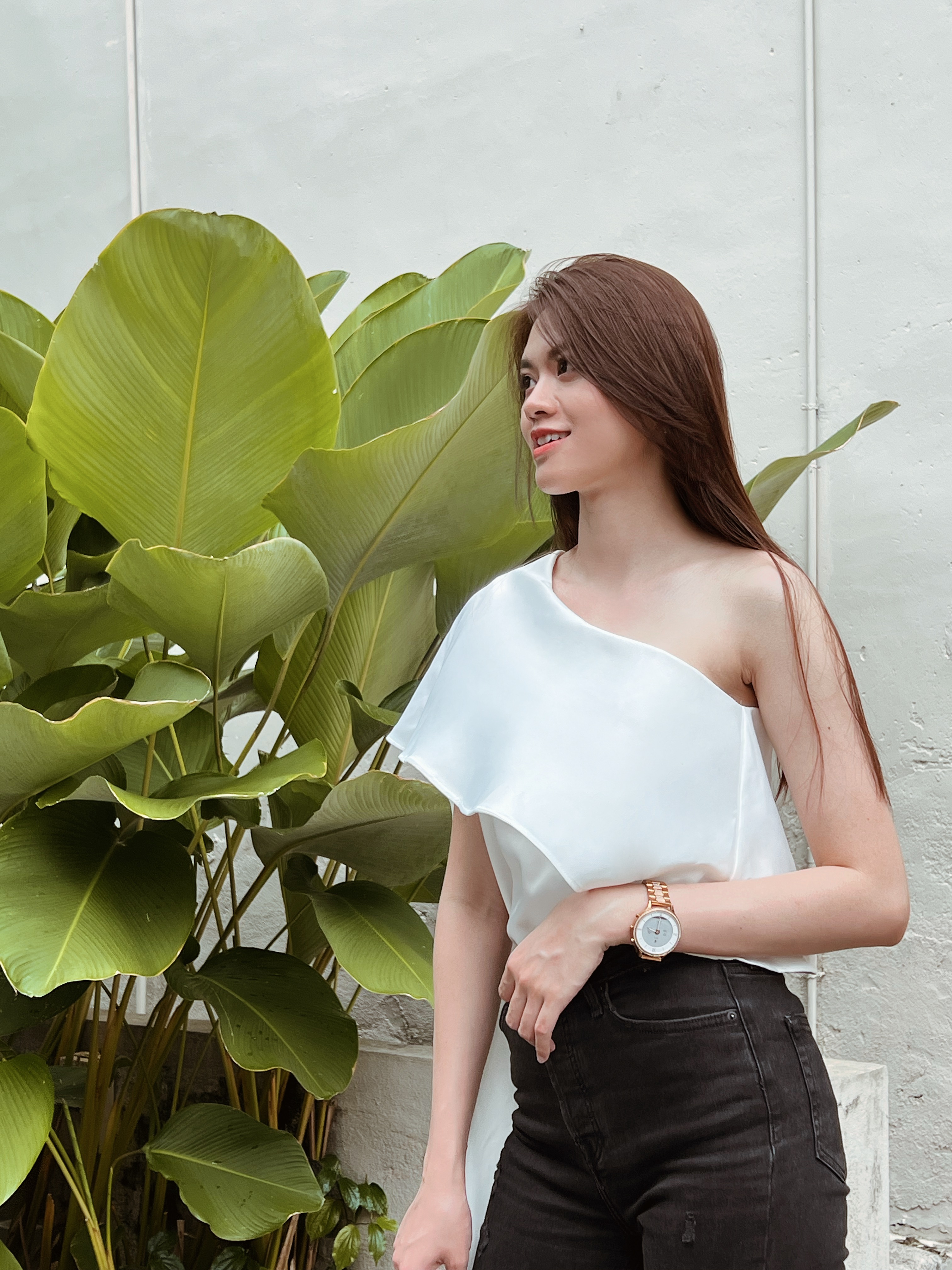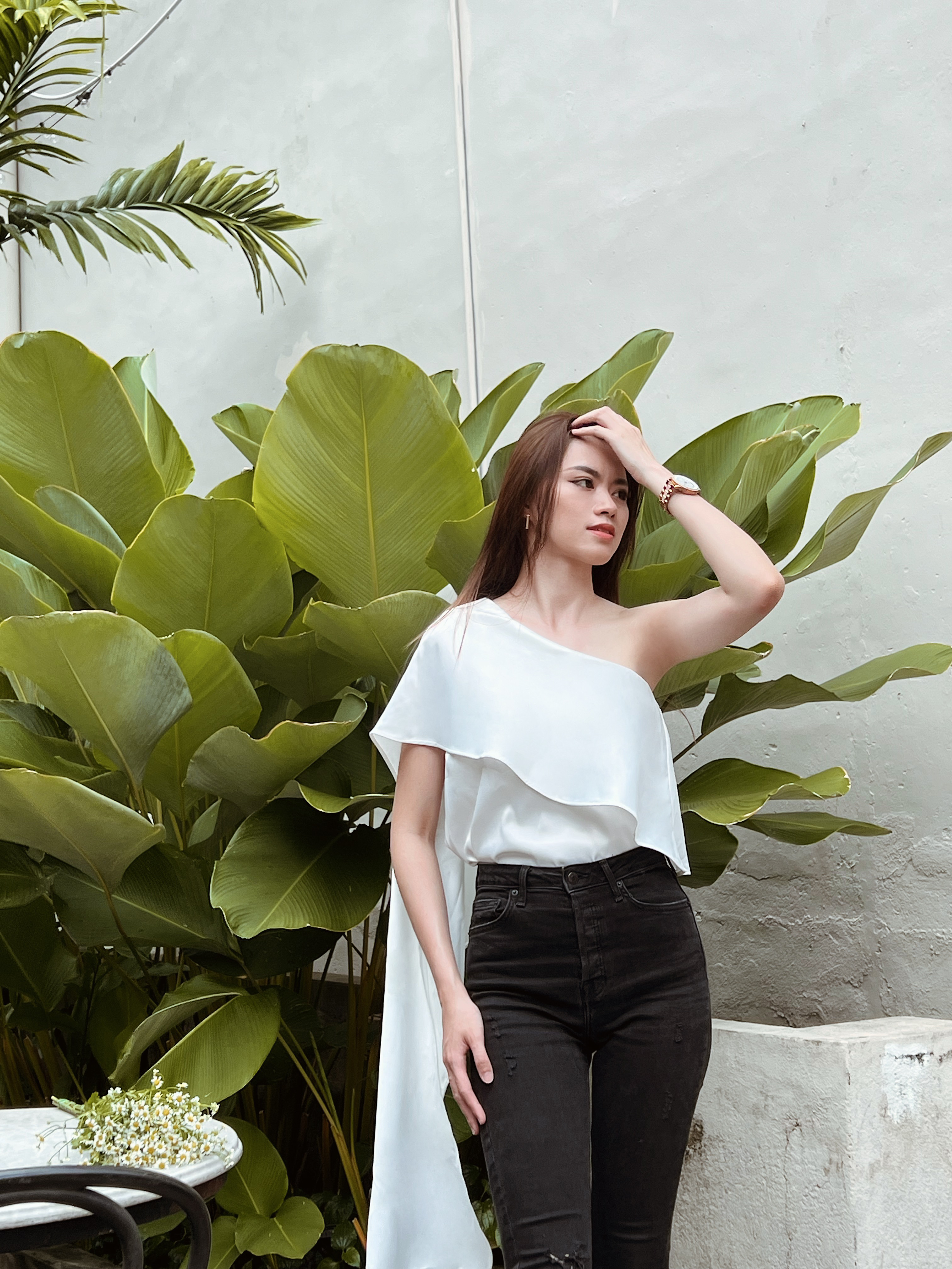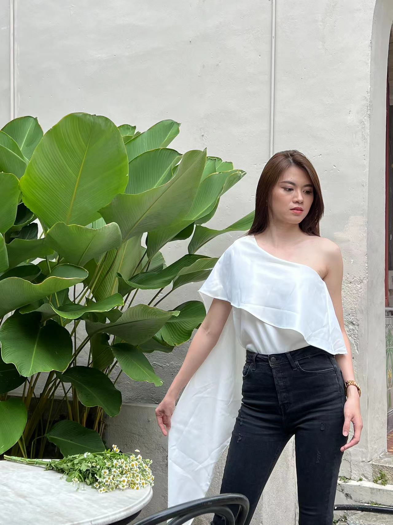 Details: Elevate your style with this elegant one-shoulder white blouse, designed for those who appreciate a touch of asymmetrical charm. The blouse features a unique one-shoulder design that adds a modern twist to a classic piece. Delicate ruffle trim adorns the neckline and extends down to the hem, creating a graceful and romantic look. The asymmetrical hemline adds a playful element, making this blouse perfect for both casual and dressy occasions. Crafted from high-quality fabric, it ensures comfort and breathability while maintaining a chic silhouette. Make a fashion statement with this stunning one-shoulder blouse that exudes sophistication and individuality.