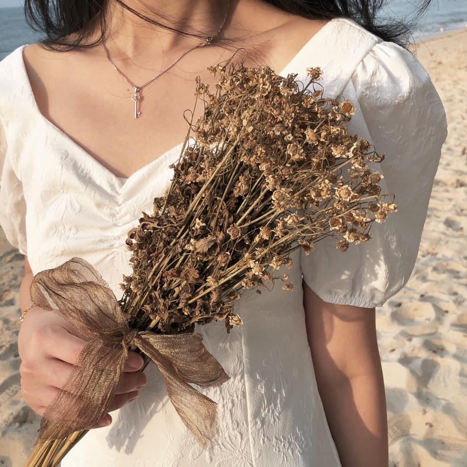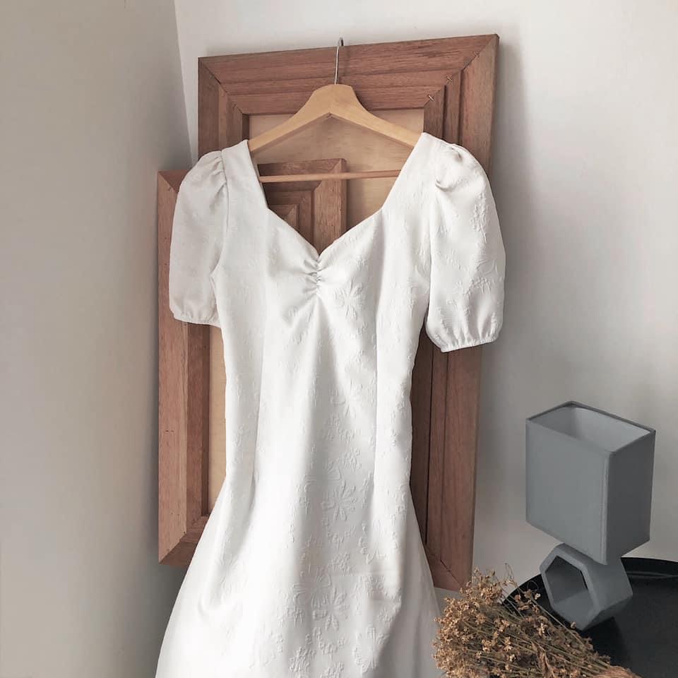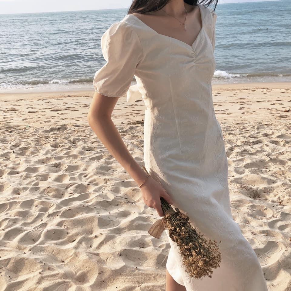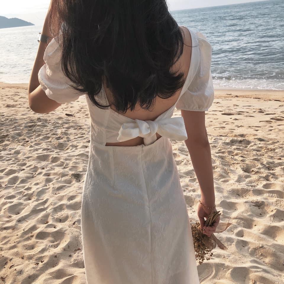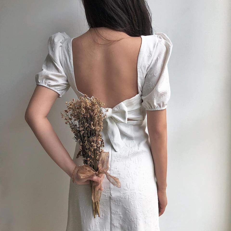 Details: The simple V-neck design exudes elegance and grace, effortlessly highlighting the neckline and accentuating a slender waist. Short puffed sleeves add a touch of sweetness and playfulness, with the voluminous silhouette softening the overall contours and bringing a hint of youthful charm. A delicate bow ties at the back's semi-sheer cutout, infusing the design with a romantic allure. The skirt falls just below the knees, flowing gracefully while maintaining a sense of refinement. Crafted from white floral-printed fabric, the dress feels fresh and natural, embodying a refined artistic quality—every step taken feels like moving through a poetic landscape.