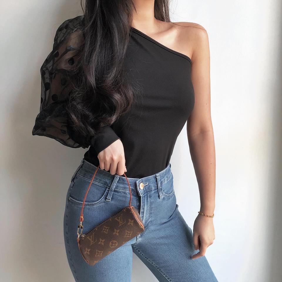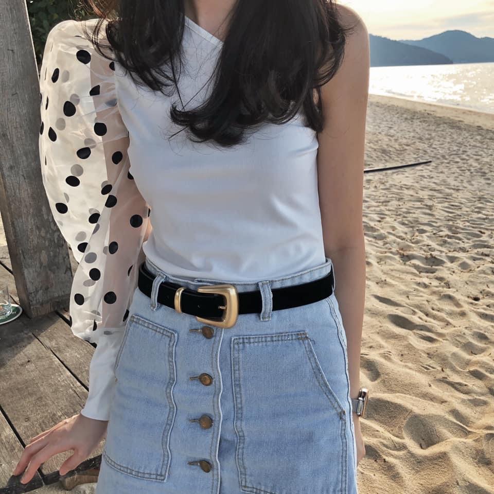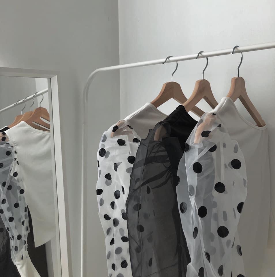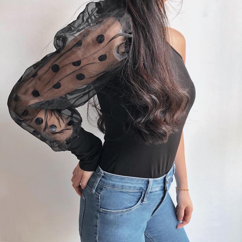Details: The blouse features a chic asymmetrical shoulder design, showcasing a unique blend of individuality and elegance. One side boasts a puffed long sleeve made from airy chiffon, adorned with delicate polka dot patterns, adding a playful and lively touch to the overall look. Crafted from silky fabric, it offers a soft, comfortable feel, combining style with a luxurious, high-end appeal. Whether in classic black or minimalist white, this piece effortlessly creates a look that is both elegant and fashion-forward.